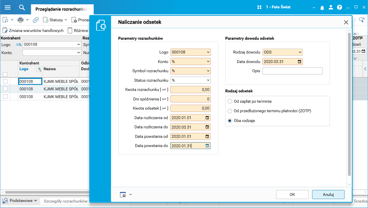 Odsetki naliczane do 31 grudnia 2019 roku korzystają z maksymalnego terminu płatności i z grupy oprocentowania zapisanych w parametrach konfiguracyjnych aplikacji oraz z grupy podanej w parametrze konfiguracyjnym (standardowo UST_ZW_TH). Natomiast odsetki naliczane od 1 stycznia 2020 roku korzystają z analogicznych parametrów związanych z rodzajem podmiotu skojarzonym z kontrahentem. Dlatego dla kontrahentów, którzy nie mają uzupełnionego rodzaju podmiotu, odsetki ZOTP nie będą naliczane w 2020 r.