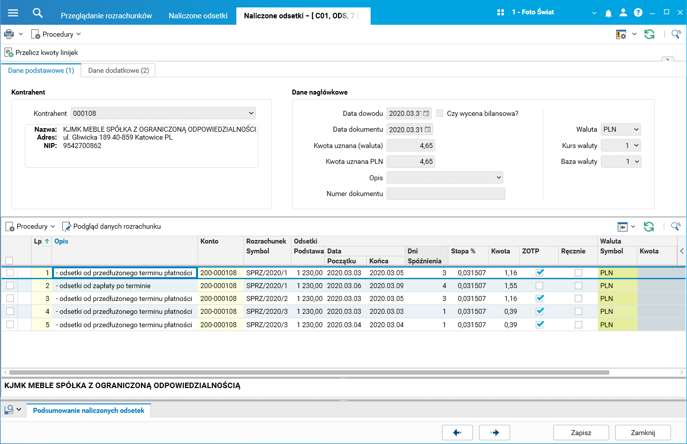 a.      Faktura SPRZ/2020/1 została zapłacona 2020.03.09, czyli odsetki ZOTP zostały naliczone dla 3 dni, natomiast odsetki za opóźnienia dla 4 dni.