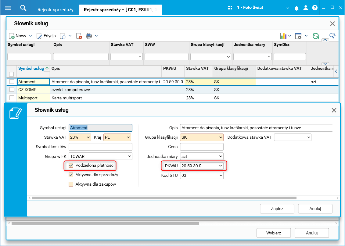1. w słowniku Słownik usług dodano znaczniki Podzielona płatność i PKWiU,