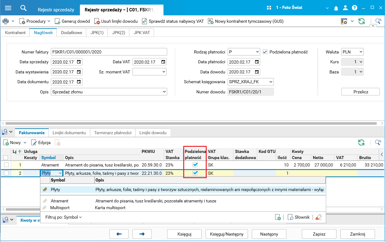 2. do linijek fakturowania usługowego dodano znaczniki Podzielona płatność i PKWiU,