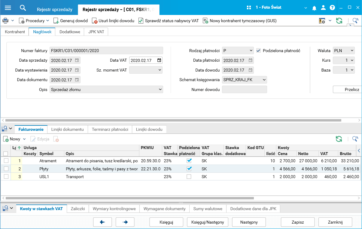 Rys. Przykładowy dokument – linijki faktury sprzedaży