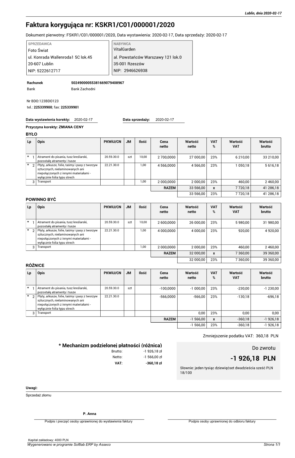 Wydruk faktury korygującej: