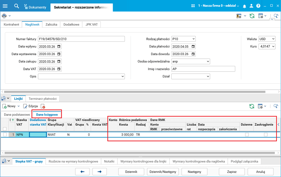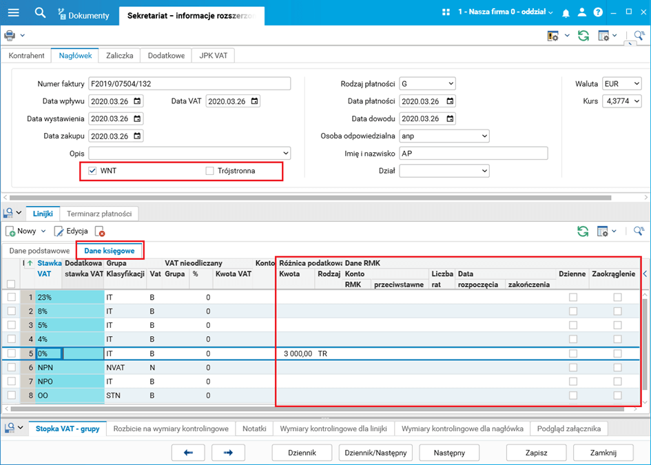 W nowym, rozszerzonym rejestrze dla dokumentów WNT dodano zakładkę Dane księgowe, gdzie istnieje możliwość wpisania dodatkowych danych wymaganych w księgowości.