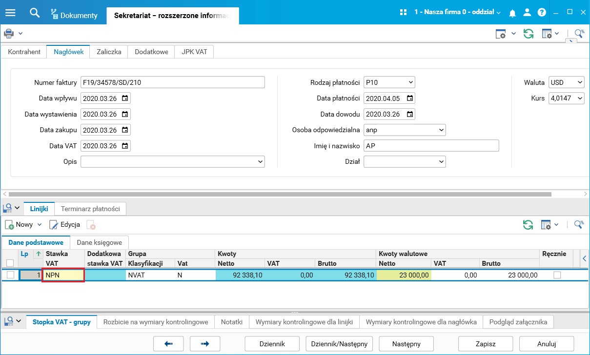 Dodatkowo podczas rejestracji dokumentu importowego w pozycjach dokumentu domyślnie proponowana jest stawka VAT – NPN – Nie podlega VAT bez prawa odliczenia.