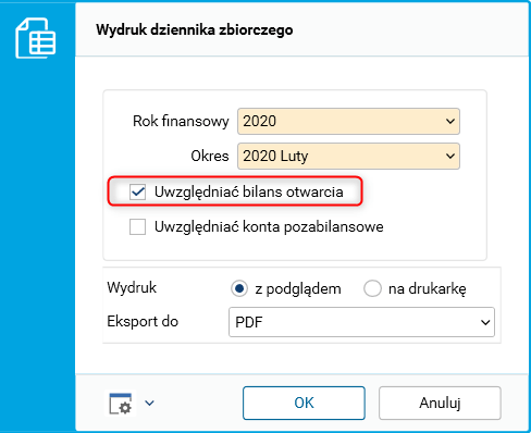 Została zachowana możliwość uwzględnienia w dzienniku obrotów bilansu otwarcia, w tym celu należy zaznaczyć parametr Uwzględniać bilans otwarcia.