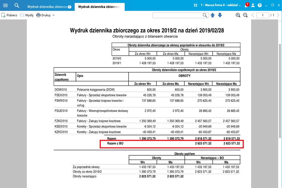 Po wybraniu tego parametru, na wydruku pojawi się dodatkowe podsumowanie Razem z BO, w którym będą ujęte obroty narastająco Wn/Ma z dowodami BO.