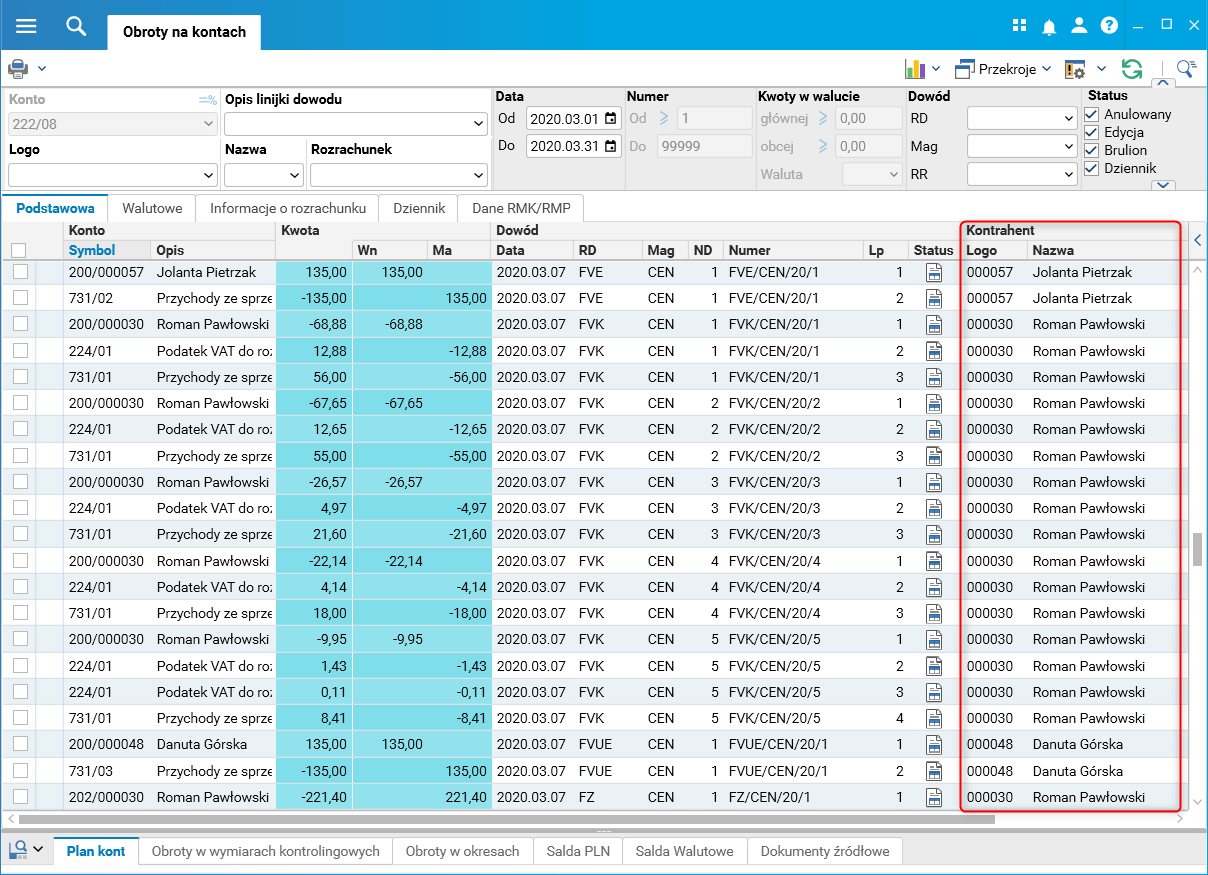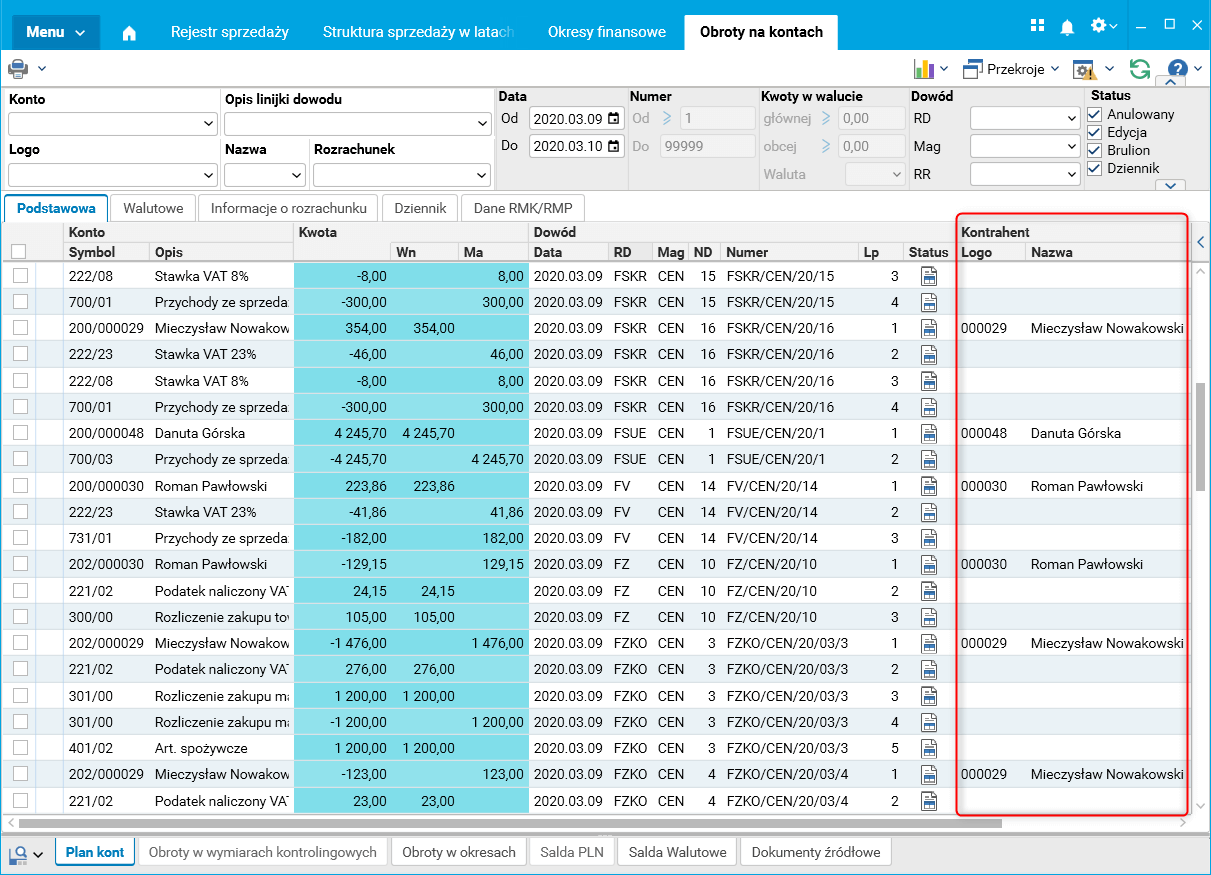 W słowniku Obroty na kontach dodano informację o kontrahencie wpisanym w nagłówku dokumentu. Do tej pory dane kontrahenta były prezentowane jedynie dla kont rozrachunkowych i pochodziły z rozrachunku. Nowa funkcjonalność jest odpowiedzią na potrzeby zgłoszone przez klientów.