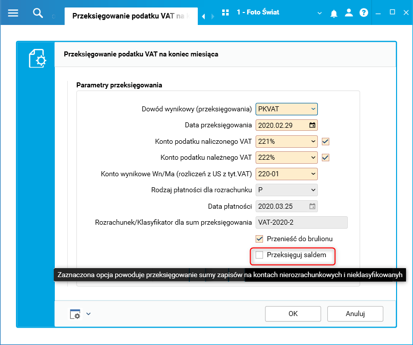 Możliwość tę dodano w procedurze Przeksięgowanie podatku VAT na koniec miesiąca, w jej parametrach dodano opcję Przeksięguj saldem.