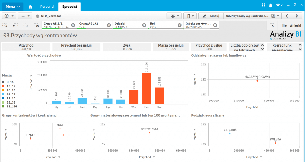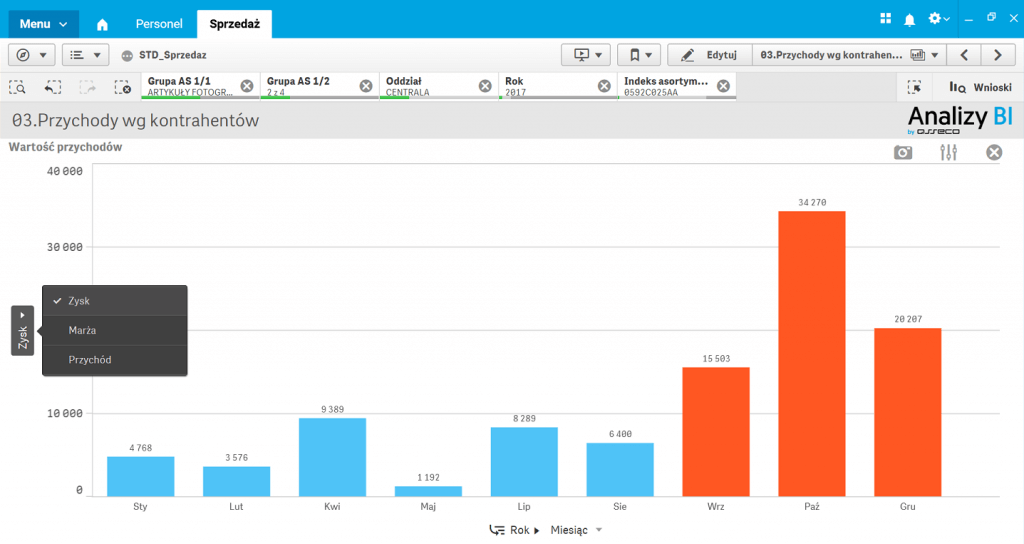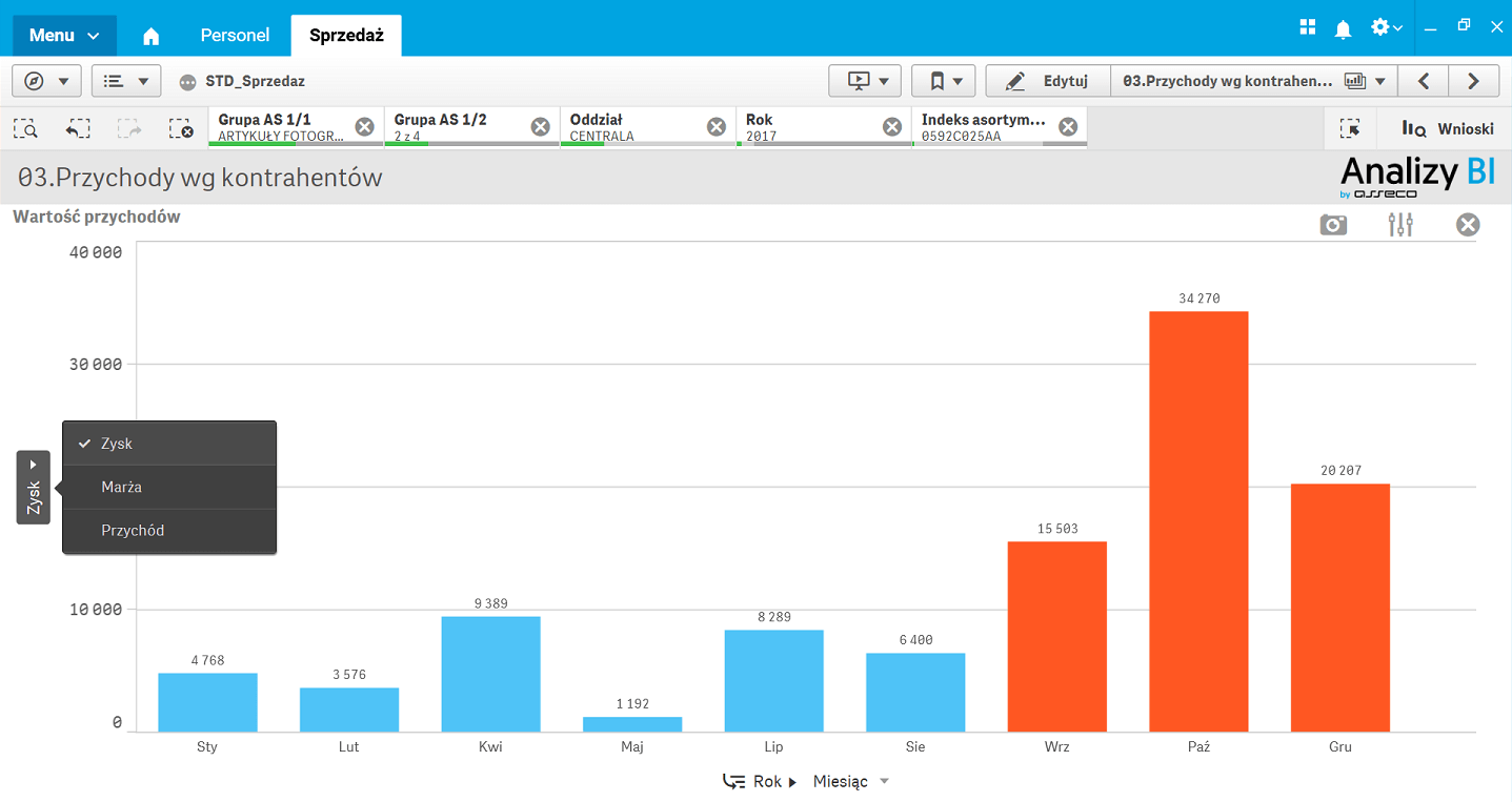 Po lewej stronie wizualizacji istnieje możliwość przełączenia miary wyświetlanych danych – z uzyskanego przychodu opcjonalnie wyświetlić można zysk. Zmiana miary nie powoduje wyłączenia wybranych selekcji (widocznych na komponencie zlokalizowanym u góry arkusza).