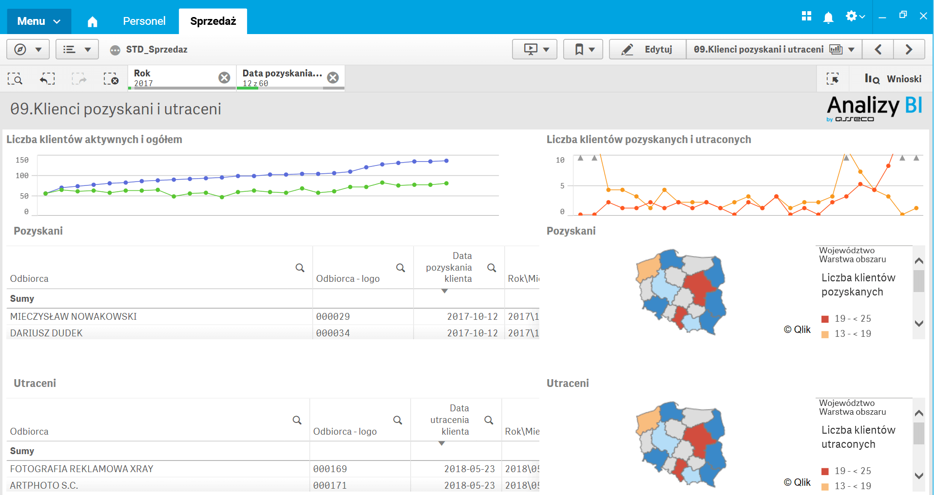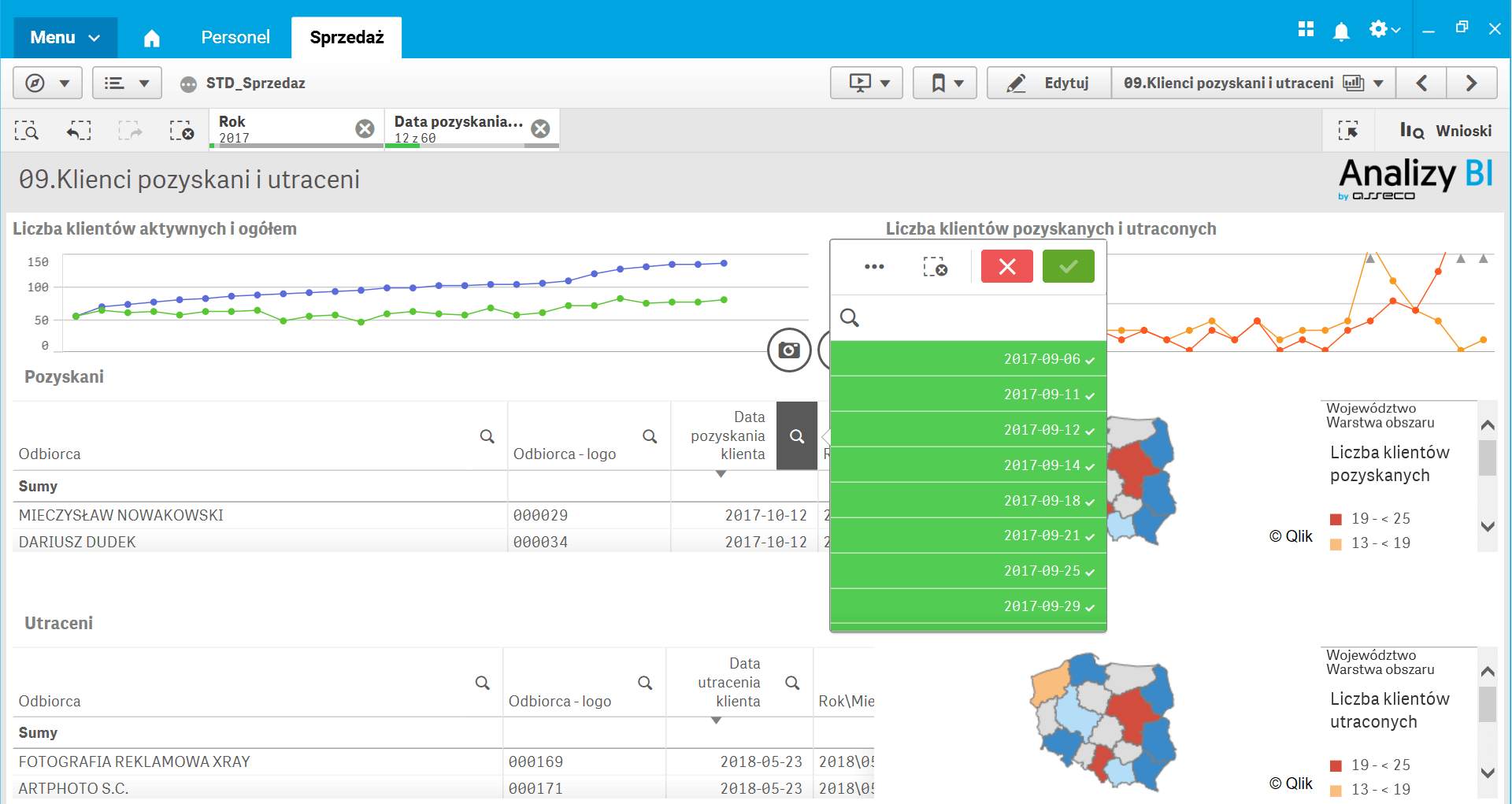 Po dokonaniu selekcji w polu Data pozyskania klienta w komponencie Pozyskani na miesiące 2017/10 oraz 2017/09 uzyskany zostanie przegląd województw (oraz powiatów) pod względem klientów pozyskanych przez przedsiębiorstwo w czasie realizowanej promocji.