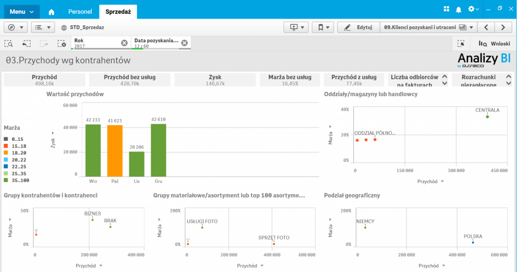 W celu wygenerowania analizy, w słowniku Sprzedaż w arkuszu analitycznym 03. Przychody wg kontrahentów dokonujemy selekcji dla roku (w przykładzie jest to rok 2017) oraz wybranych grup asortymentu.