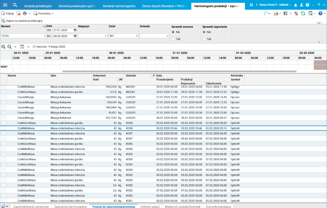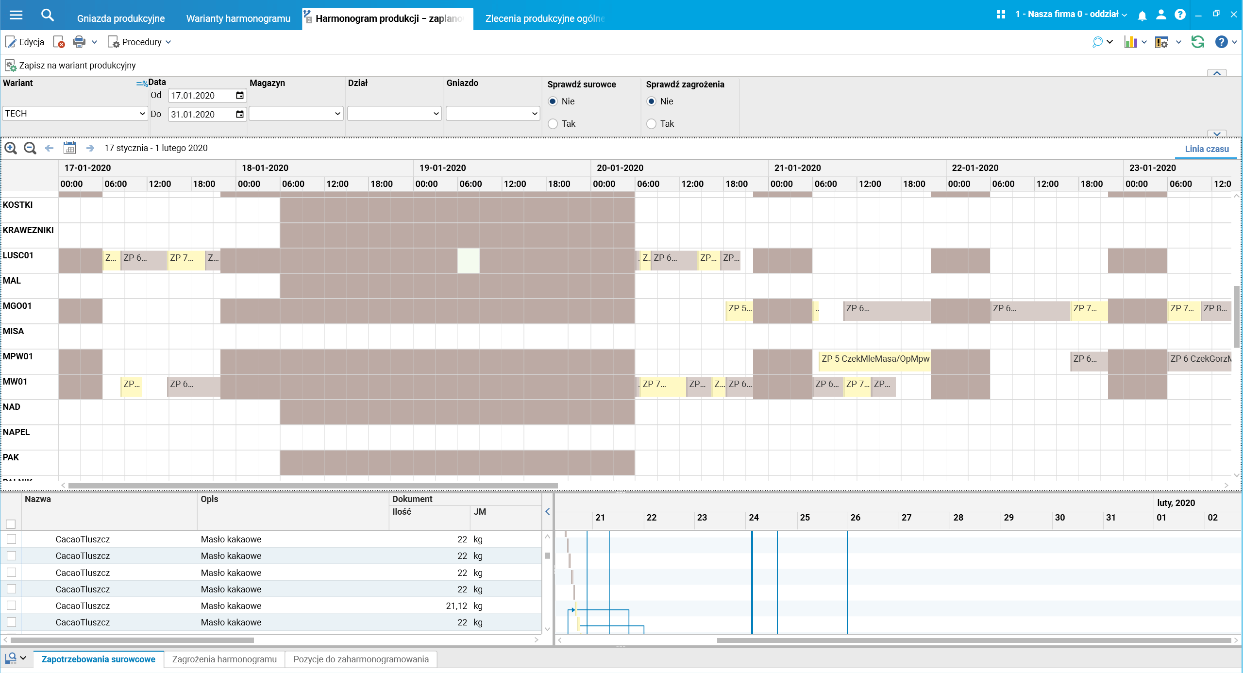 Nowością w przeglądarce harmonogramu produkcji są dwie dodatkowe przestrzenie (okna) pod harmonogramem, opisane poniżej: