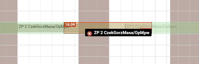 o   Swobodny – brak ograniczeń jak powyżej. Jeżeli zlecenie zostaje przeciągnięte w miejsce, gdzie istniało inne zlecenie, zostanie pokolorowane na czerwono. Czas trwania zlecenia dostosowuje się do wydajności w danym okresie i jest proporcjonalnie wydłużany (skracany). Na zielono wyświetla się gniazdo, na którym zlecenie może być realizowane (przykład poniżej).