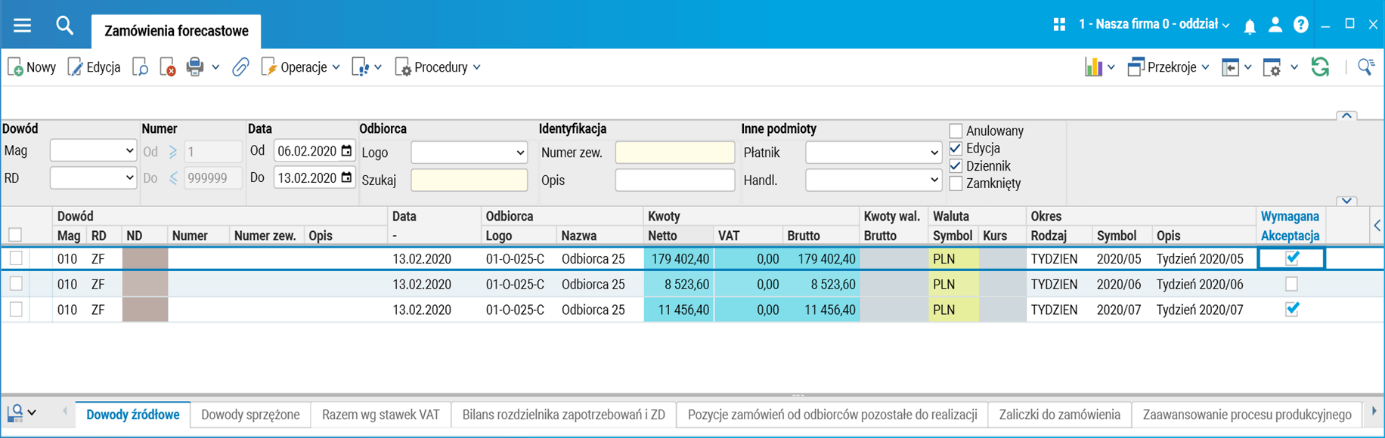 W wersji 98 ulepszona została obsługa zamówień forecastowych, czyli prognozy zapotrzebowania od odbiorców. Dodane zostały pola ułatwiające zarządzanie modyfikacjami prognozowanych ilości w dokumencie zamówienia.