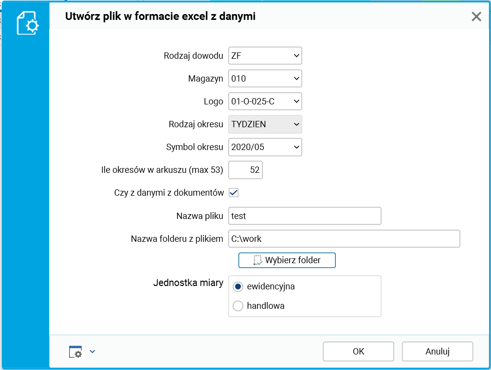 Rys. Parametry procedura Utwórz plik w formacie Excel z danymi