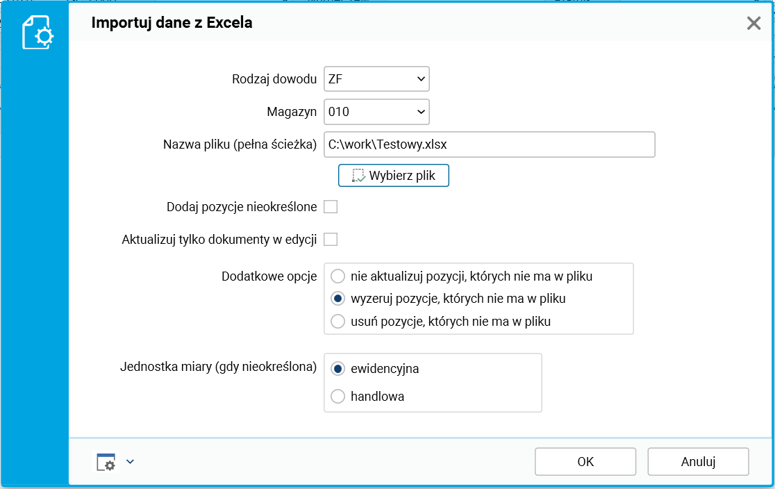 Procedura Importuj dane z Excela służy do pobrania danych z pliku (importu).