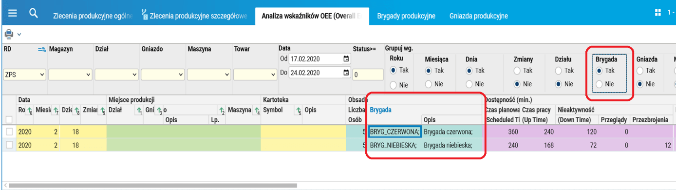 Dodatkowy poziom grupowania realizuje nowy filtr Grupuj wg; Brygada dodany w słowniku Analiza wskaźników OEE (Overall Equipment Effectiveness). Umożliwia on przeglądanie wyników analizy efektywności produkcji (wykorzystania sprzętu) pogrupowanych wg brygad produkcyjnych.