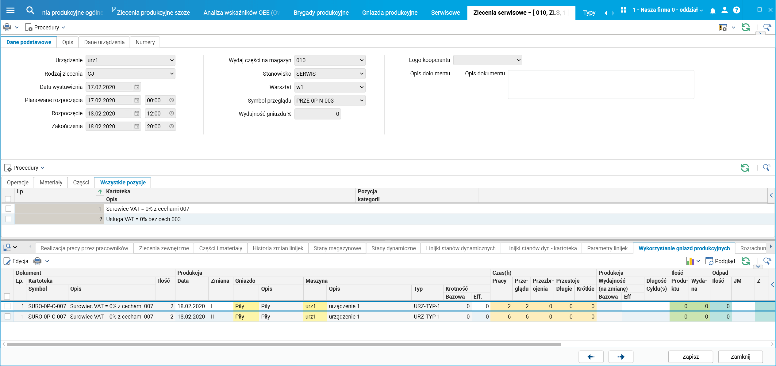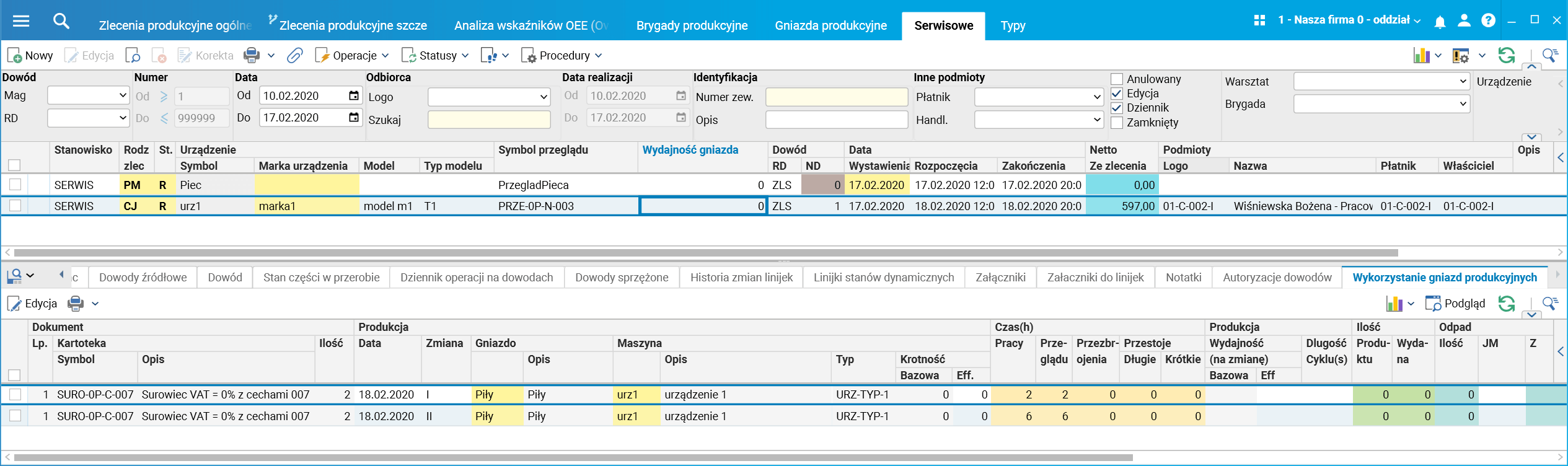 Uwzględnienie w analizie wskaźników OEE czasu trwania przeglądów jest możliwe na podstawie danych uzyskanych ze zleceń serwisowych (Utrzymanie ruchu). W tym celu w rejestrze Zlecenia serwisowe dodany został szczegół Wykorzystanie gniazd produkcyjnych, który stanowi źródło danych dla analizy OEE.