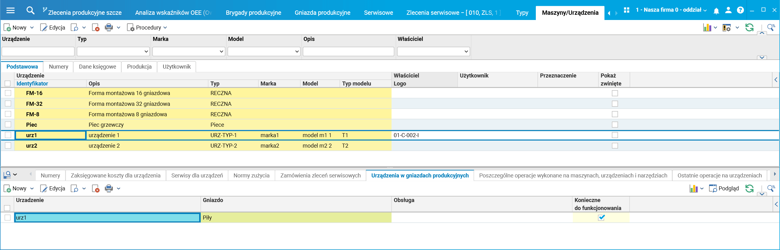Wykorzystanie gniazda produkcyjnego uzupełniane jest na podstawie przypisania urządzenia do gniazda, którego dotyczy serwis (słownik Maszyny/Urządzenia, szczegół Urządzenia w gniazdach produkcyjnych) tylko wtedy, gdy urządzenie jest konieczne do funkcjonowania gniazda (aktywny przełącznik Konieczne do funkcjonowania).