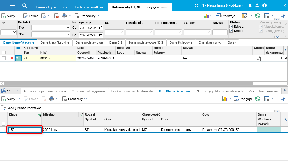 Automatycznie założony klucz kosztowy widoczny jest w szczególe ST – klucze kosztowe:
