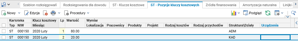 · ST – pozycje kluczy kosztowych.