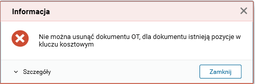 Rys. Komunikat przy próbie usunięcia dokumentu OT z pozycjami klucza kosztowego