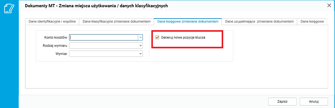 Zgodnie z logiką modułu ST po wystawieniu kolejnego dokumentu lub zaksięgowaniu dokumentu OT pozycje kluczy kosztowych nie są udostępnione do edycji. W takiej sytuacji, aby zmienić pozycje klucza, należy wystawić dokument MT (zmiana miejsca użytkowania / danych klasyfikacyjnych) i w zakładce Dane księgowe zmieniane dokumentem MT zaznaczyć opcję Generuj nowe pozycje klucza. Dokument MT dodający nowe rozbicie musi być wystawiony na pierwszy dzień miesiąca. Od tego dnia księgowania wykorzystują nowe rozbicie. Nowe rozbicie jest kopiowane z poprzedniego i dostępne do edycji w szczególe dokumentu MT lub z poziomu kartoteki, dopóki nie zostanie dla niej wystawiony kolejny dokument.