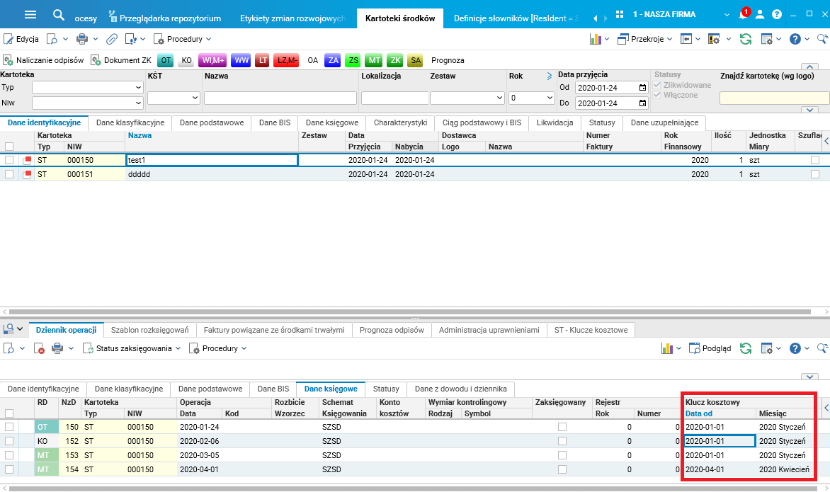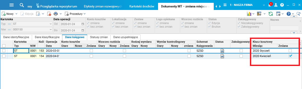 Nie każdy dokument MT zmienia pozycje klucza. Zmiany klucza kosztowego widoczne są w zakładce Dane księgowe szczegółu Dziennik operacji w słowniku Kartoteki środków: