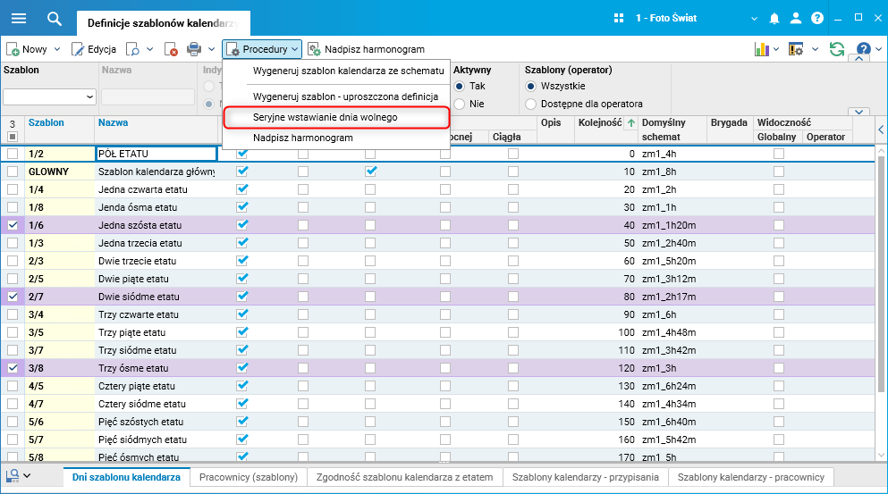 W słowniku Szablony kalendarzy zaznaczamy odpowiednie szablony kalendarzy, uruchamiamy procedurę Seryjne wstawianie dnia wolnego i uzupełniamy jej parametry.