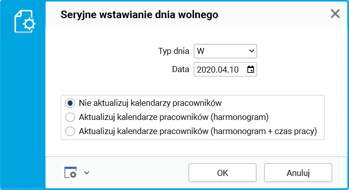 Po wprowadzeniu parametrów procedurę Seryjne wstawianie dnia wolnego należy zatwierdzić przyciskiem OK.