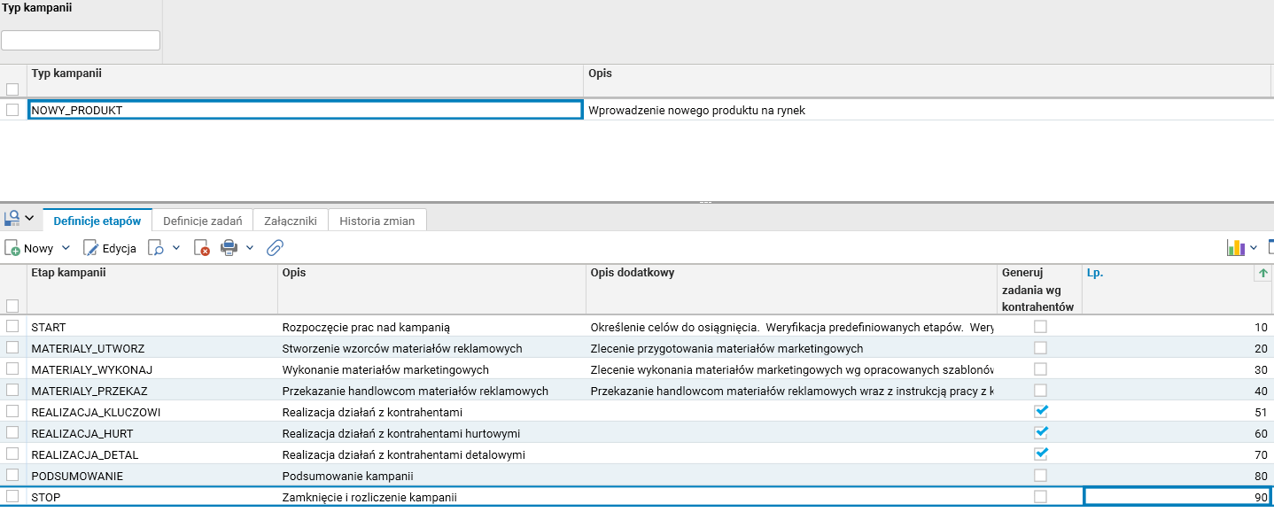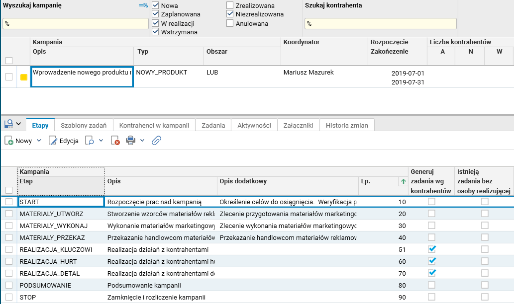 Po utworzeniu kampanii system automatycznie, na podstawie wcześniej zdefiniowanych etapów i zadań, tworzy analogiczne struktury połączone z nową kampanią.