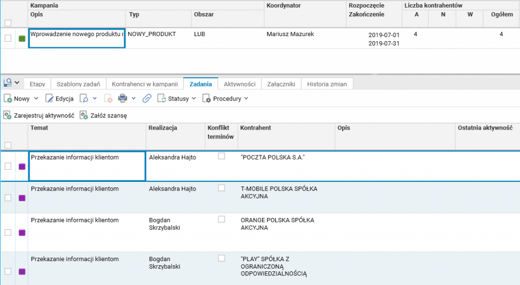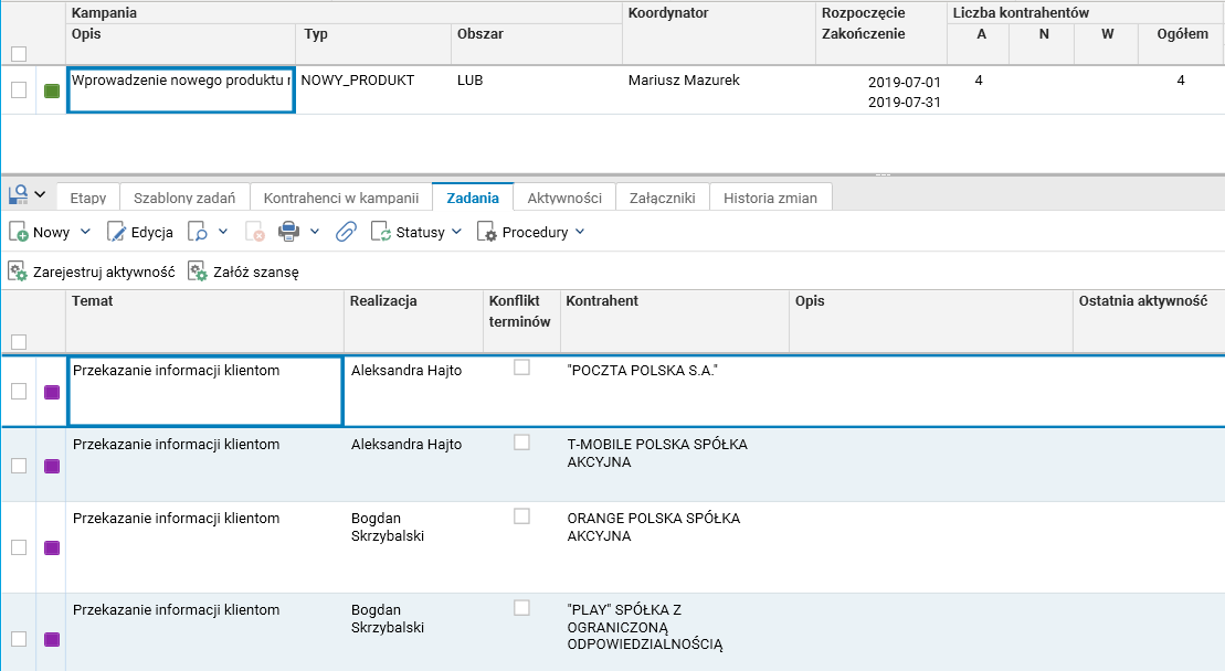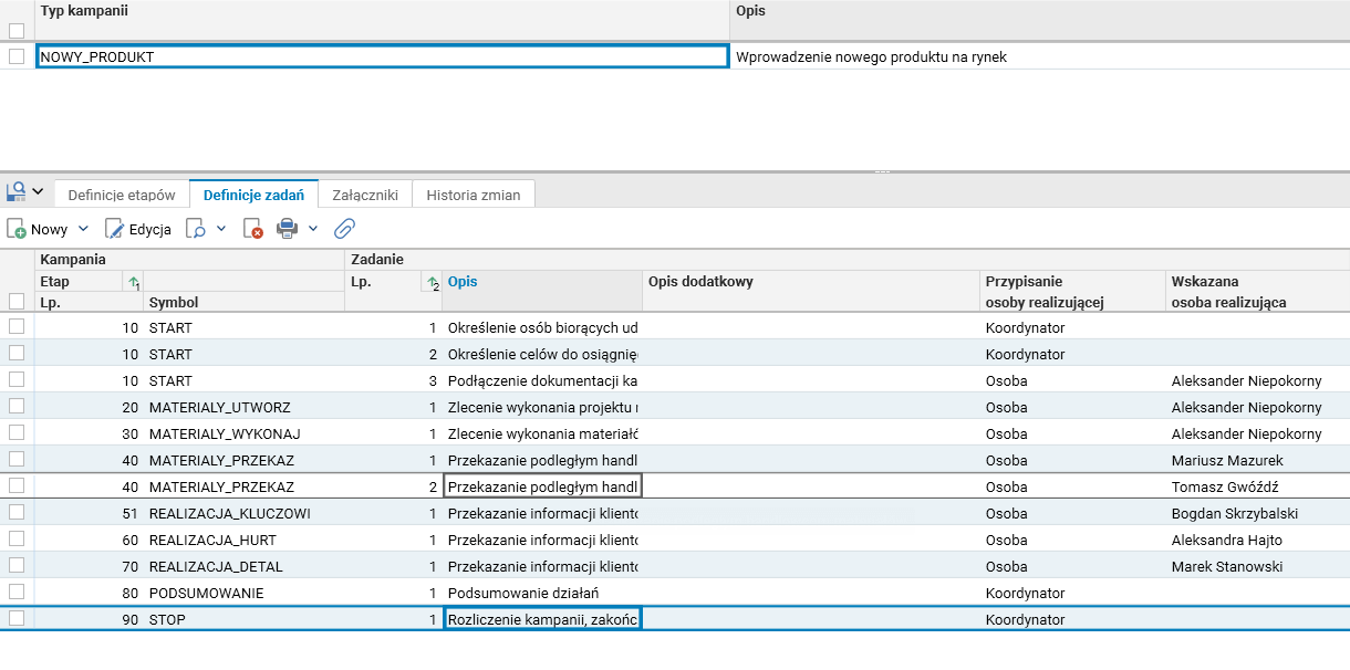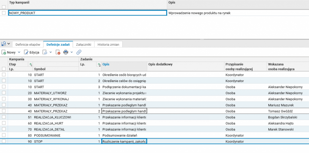 Także na kolejnych etapach kampanii system generuje zadania osobom wskazanym jako odpowiedzialne za realizację poszczególnych etapów kampanii.