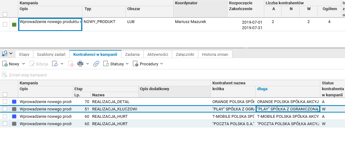 Nowo utworzona kampania ma status Nowy. Na tym etapie możemy doprecyzować konfigurację kampanii, np. edytować jej etapy, dodać nowe zadania, dodać kontrahentów biorących udział w kampanii.