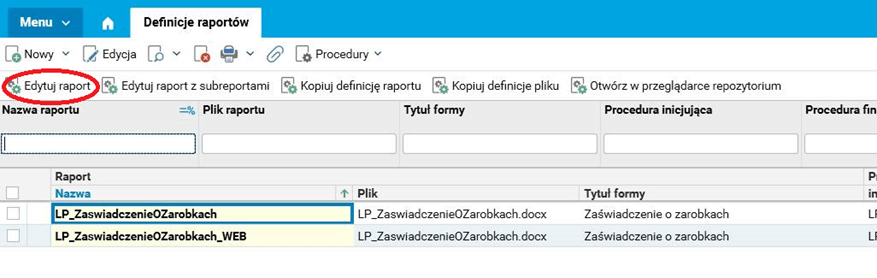 Aby rozpocząć prace konfiguracyjne, uruchamiamy procedurę Edytuj raport. Wówczas wybrany raport otworzy się w aplikacji Microsoft Word, za pomocą której możemy go edytować.