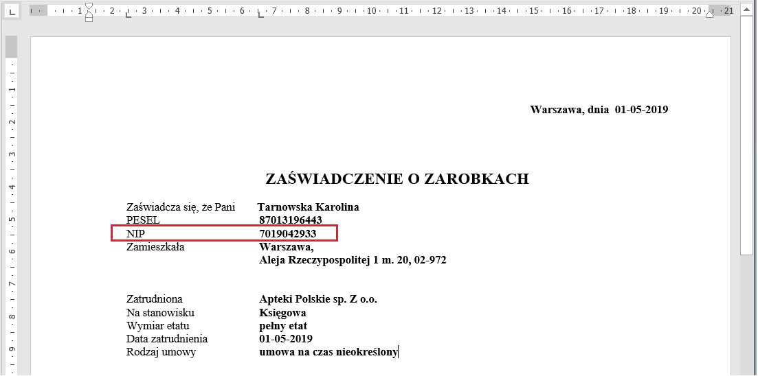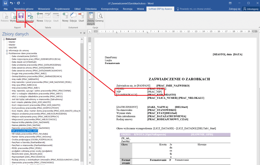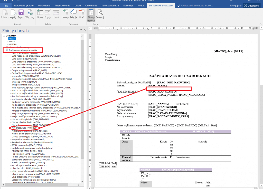 Rys. 2. Dodanie do zaświadczenia o zarobkach numeru NIP pracownika metodą drag&drop