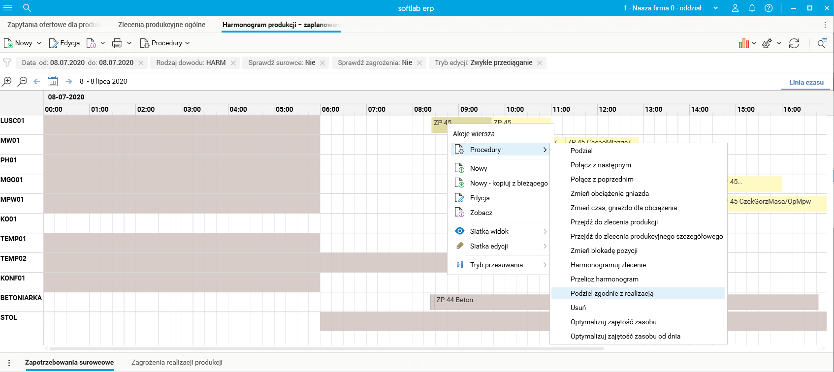 Rys. Słownik Harmonogram produkcji – zaplanowane zadania z widocznymi procedurami