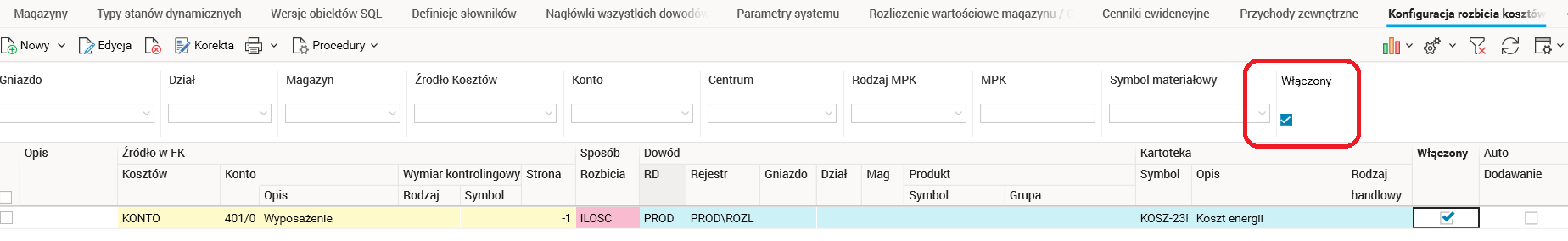 W słowniku Konfiguracja rozbicia kosztów dodano filtr Włączony pozwalający na ukrywanie nieaktywnych (wyłączonych) kluczy podziału (rozbicia) kosztów. Filtr domyślnie jest aktywny.