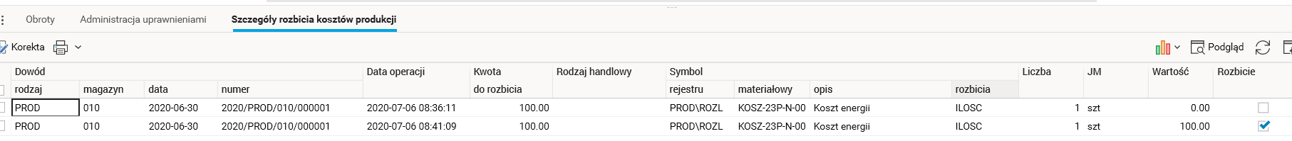 Log operacji rozbijania i wycofywania rozbicia kosztów dostępny jest w szczególe Szczegóły rozbicia kosztów produkcji.