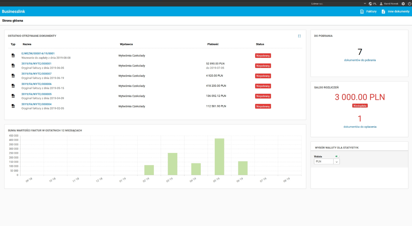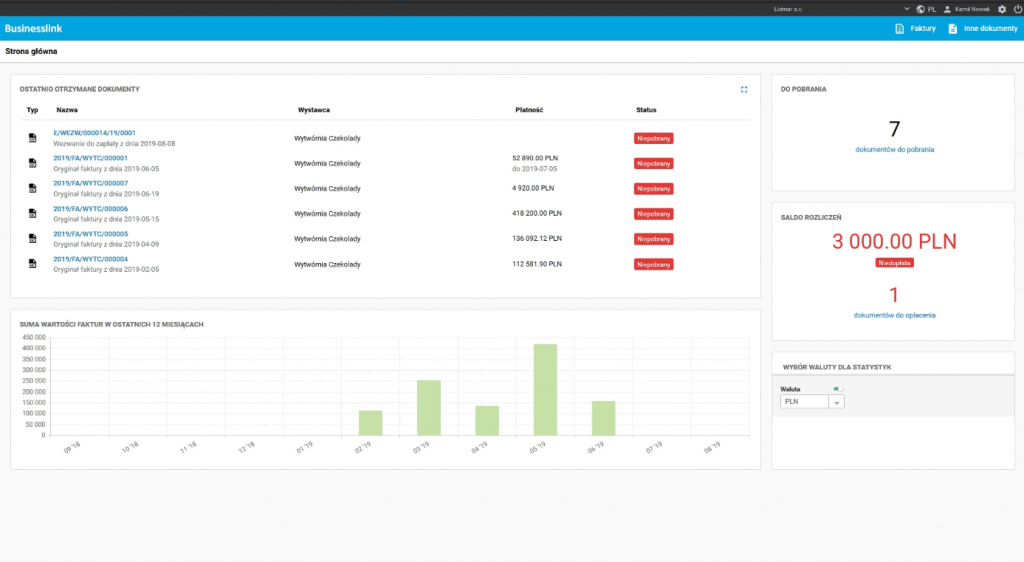 - Możliwość przeglądania statystyk w podziale na waluty, jeżeli do portalu dostarczane są dokumenty w wielu walutach.