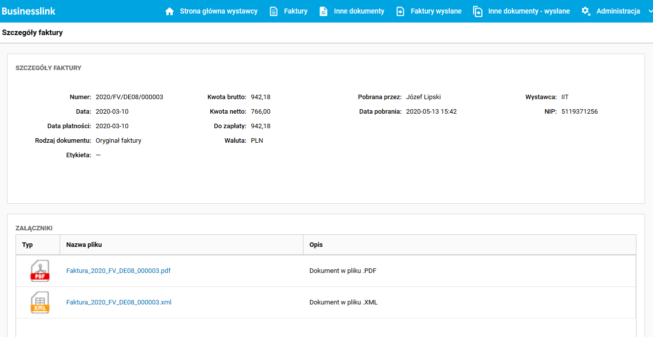 W usłudze dodano możliwość pobierania wielu załączników na raz. Zarówno w oknie Faktury, jak i Inne dokumenty umieszczony został przycisk akcji Pobierz załącznik. Po wybraniu wielu dokumentów i kliknięciu tego przycisku możliwe jest pobranie wielu załączonych plików PDF w postaci paczki ZIP: