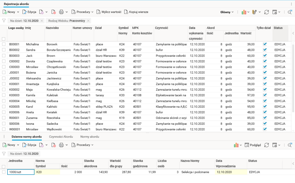 Po pierwsze, akord musi być związany z określoną normą pracy do wypracowania, którą trzeba w systemie zarejestrować. Każdy pracownik pracujący na akordzie musi wiedzieć, jaką normę musi wyrobić i jakie za to otrzyma wynagrodzenie.