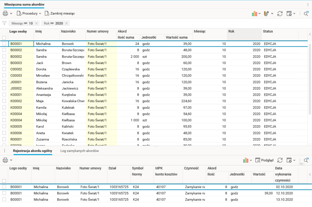 Podczas naliczania listy płac za przepracowany miesiąc kwoty wynagrodzenia akordowego w statusie Zamknięte zostały odpowiednio uwzględnione.