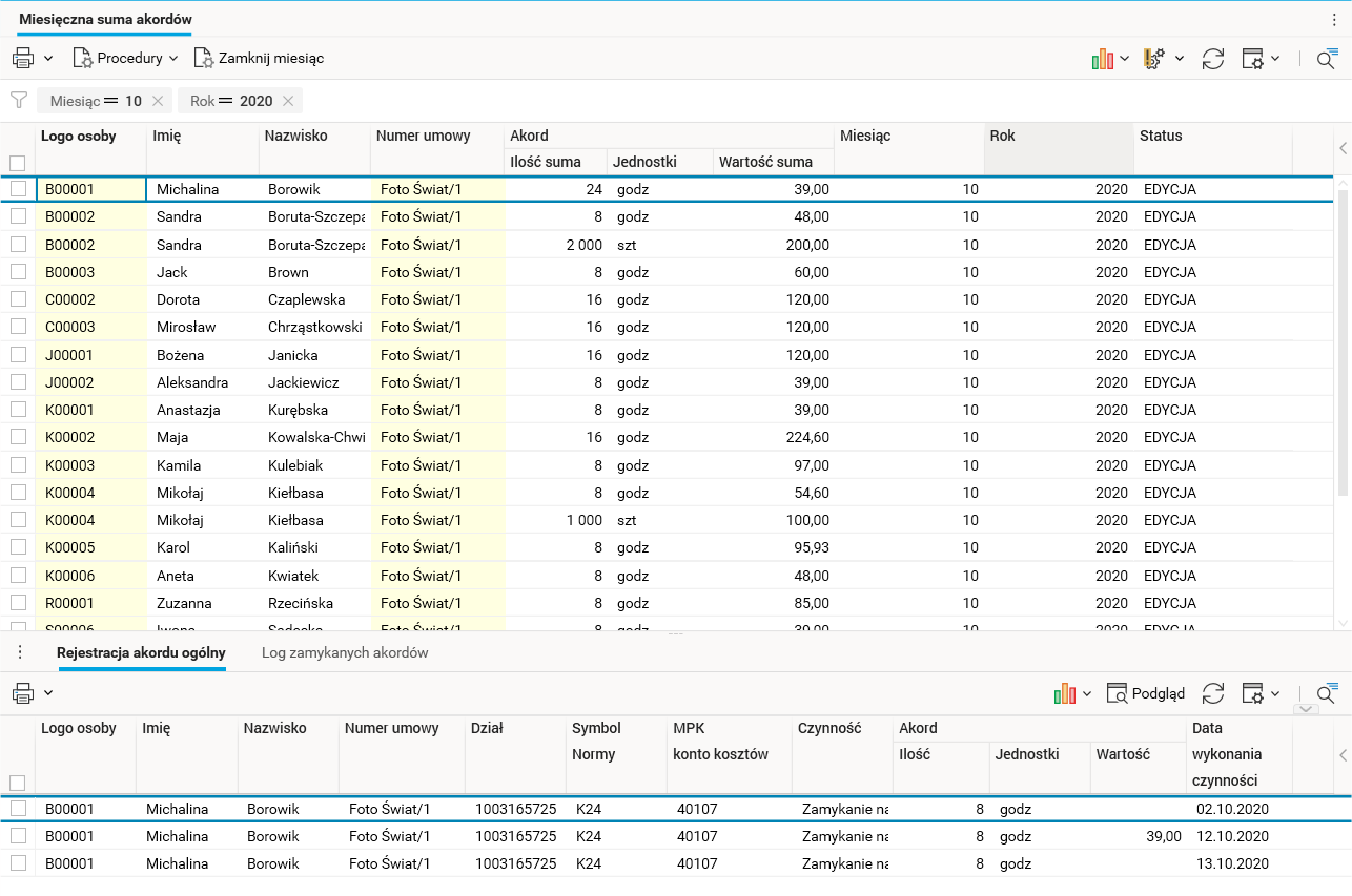 Na koniec miesiąca pracownik HR użył procedury Wylicz wartość do obliczenia wynagrodzenia akordowego przypadającego na poszczególnych członków grupy. Następnie w słowniku Miesięczna suma akordów zweryfikował naliczenia i zmienił ich status na Zamknięte.