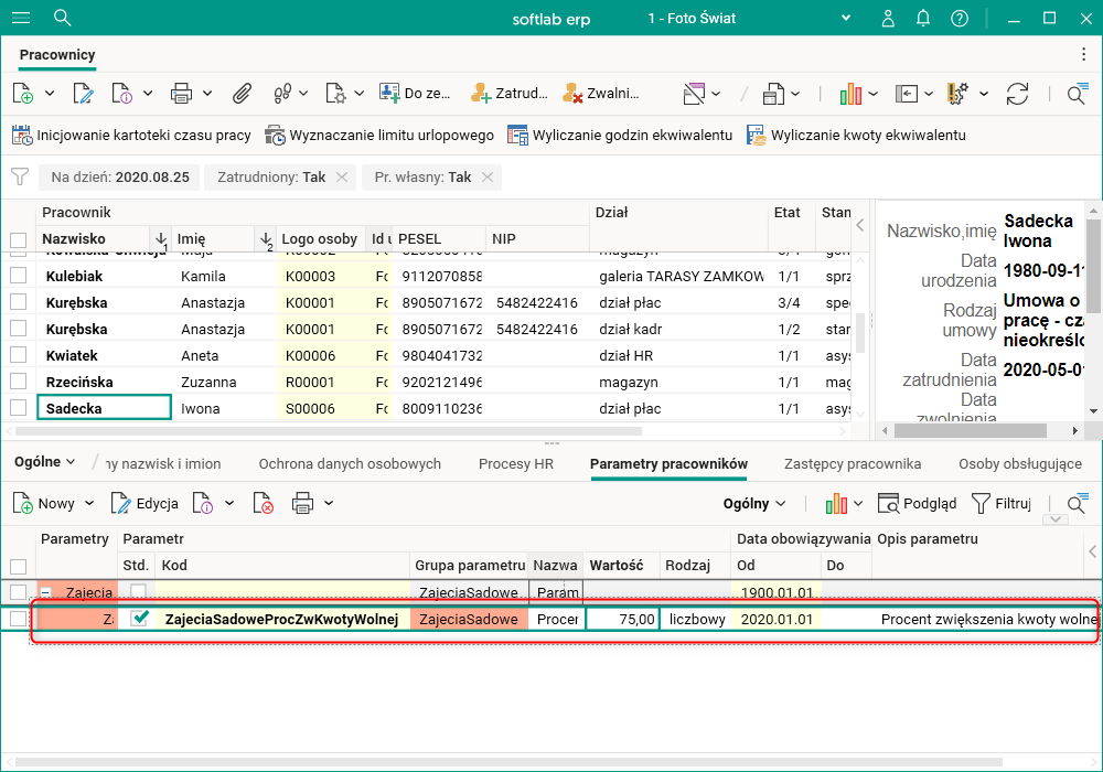 Rys. Wprowadzona wartość parametru ZajeciaSadoweProcZwKwotyWolnej w szczególe Parametry pracowników słownika Pracownicy