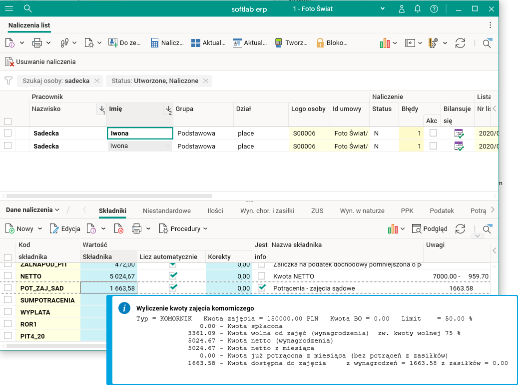 Rys. Informacje dotyczące wyliczenia kwoty zajęcia komorniczego w szczególe Składniki słownika Naliczenia list