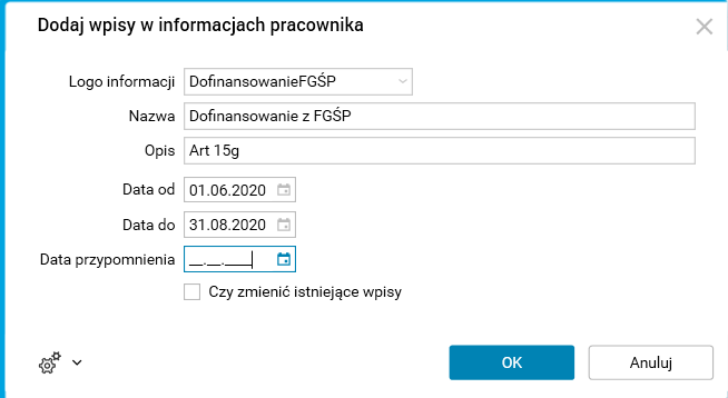 ·         Czy zmienić istniejące wpisy – zaznaczenie tej opcji spowoduje, że jeżeli pracownik ma już zarejestrowaną informację z tym samym logo informacji i dacie „od”, wówczas procedura nadpisze ją (zaktualizuje). Jeżeli natomiast system nie odnajdzie takiego wpisu, to zostanie dodany nowy wpis.