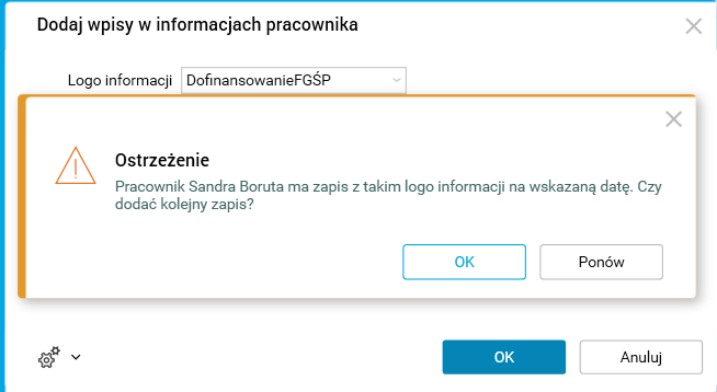 W sytuacji, gdy pole Czy zmienić istniejące wpisy nie zostanie zaznaczone, a pracownik będzie posiadał już wpis z takim logo informacji na wskazaną datę „od”, to wówczas wyświetli się ostrzeżenie przed aktualizacją informacji pracownika.