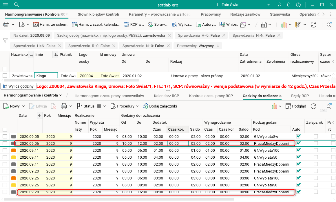 Rys. Wyliczone godziny typu PracaMiedzyDobami w szczególe Godziny do rozliczenia w słowniku Harmonogramowanie i Kontrola RCP