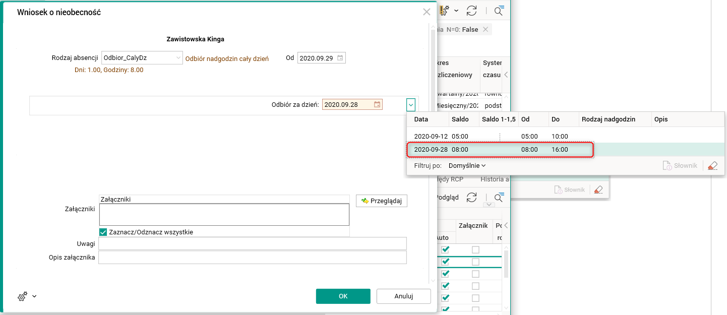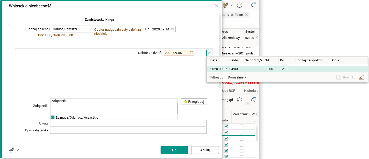 W ramach nowej funkcjonalności został rozszerzony mechanizm obsługujący odbiór nadgodzin. Podczas wprowadzania odbioru nadgodzin za pomocą procedur Wniosek o nieobecność i Kreator urlopów godziny pracy między dobami są widoczne w liście rozwijanej. W zależności od typu odbioru, który zostanie wybrany, dostępne będą odpowiednie godziny, tzn. dla odbioru za niedzielę do wyboru będą tylko godziny między dobami wypracowane w niedzielę.