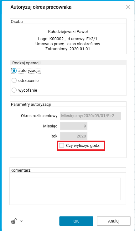 Uwaga! Pole Czy wyliczyć godz. jest dostępne jedynie dla rodzaju operacji autoryzacja. Dla wartości odrzucenie lub wycofanie jest ono niewidoczne.
